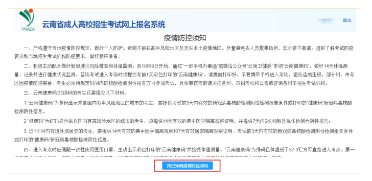5.這時(shí)考生要注意頁面通知內(nèi)容,認(rèn)真閱讀《疫情防控須知》,點(diǎn)擊“我已知曉疫情防控須知”按鈕。