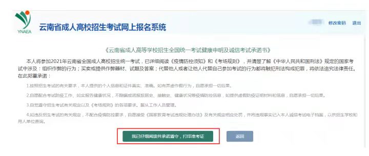 8.考生要仔細(xì)閱讀《云南省成人高等學(xué)校招生全國統(tǒng)一考試健康申明及誠信考試承諾書》,點(diǎn)擊“我已仔細(xì)閱讀并承諾遵守,打印準(zhǔn)考證”按鈕。