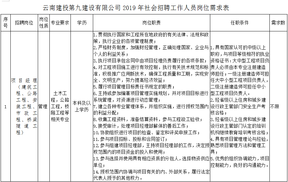 云南建投第九建設有限公司2019年社會招聘簡章