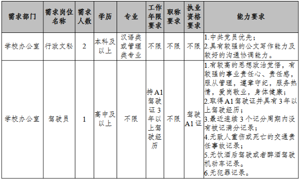 為適應(yīng)學校發(fā)展的需要,需面向社會誠聘2名行政人員及1名駕駛員,現(xiàn)將有關(guān)事項公告如下: