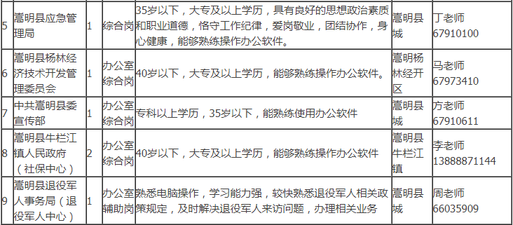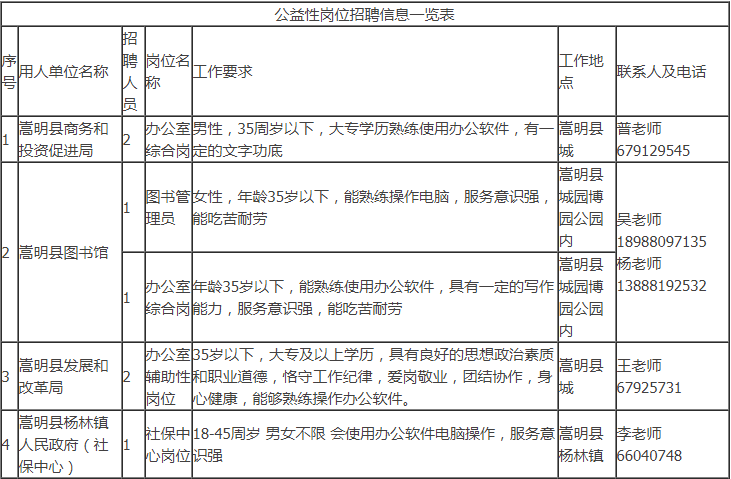 招聘具體事宜請(qǐng)咨詢用人單位。符合公益性崗位上崗條件的個(gè)人也可以到嵩明縣勞動(dòng)就業(yè)服務(wù)局綜合科申請(qǐng)公益性崗位求職登記,詳詢陳老師:0871-67917444。